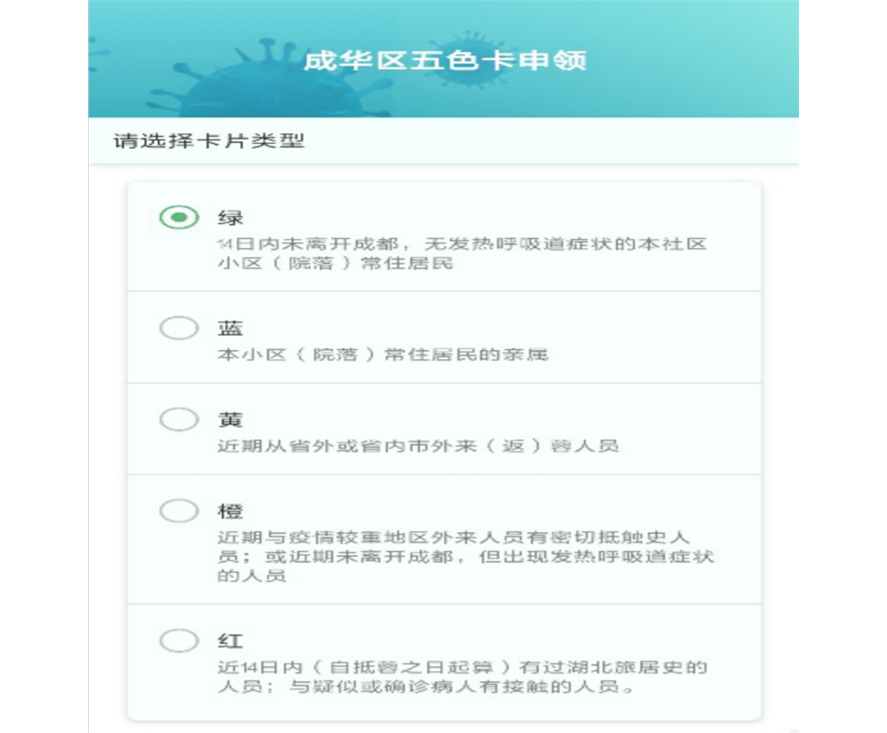 據介紹,“五色卡”管理系統根據色卡顏色不同,對未離蓉、外地返蓉、具備發(fā)熱呼吸道癥狀、有過湖北旅居史、與疑似或確診病人有接觸、臨時進入小區(qū)院落等各類人群進行區(qū)分,具備信息線上填報、統計、查詢及工作人員驗證等多種功能,從而實現對高風險人群信息及健康狀況及時掌握、上報,并有效管控潛在傳染源。為避免線下領卡點人群聚集,系統同時提供了移動端。小區(qū)住戶可通過掃描五色卡二維碼進入小程序,錄入姓名、身份證后四位并上傳照片后領取電子五色卡。