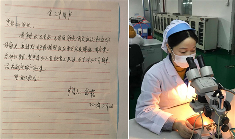 2月1日大年初八,電位器測(cè)量員翁霞親手將自己的復(fù)工申請(qǐng)交到了車間主任的手中。