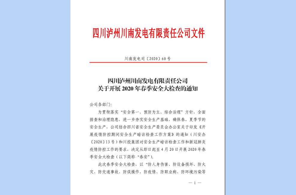 為落實省安委會和川投集團關(guān)于開展安全生產(chǎn)暗訪檢查工作要求和新冠肺炎疫情防控工作要求,貫徹“安全第一、預(yù)防為主、綜合治理”方針,進一步夯實安全生產(chǎn)基礎(chǔ),切實做到春、夏季節(jié)公司安全生產(chǎn)穩(wěn)定,3月4日,川南發(fā)電公司印發(fā)《關(guān)于開展2020年春季安全大檢查的通知》,標志著2020年度春季安全大檢查正式啟動。