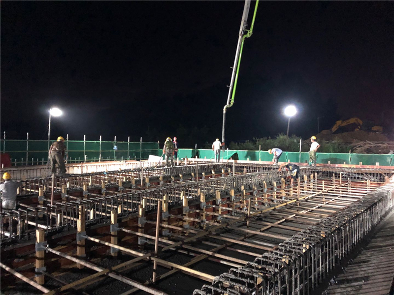 外環(huán)路西三段南延線項目作為中國牙谷功能性項目中的“硬骨頭”,受汛情、雨水等影響,施工進度落后于“百日攻堅”工作要求,特別是橋梁一直無法澆筑,得知9月17日天氣放晴,施工方提前備齊澆筑機械、材料,全體工人卯足干勁,誓在一天內將橋梁第一跨澆筑完畢。截止到傍晚21:00,第一跨右幅箱梁澆筑C50砼工程全部完工,為外環(huán)路西三段南延線項目按時完工打下堅實基礎。