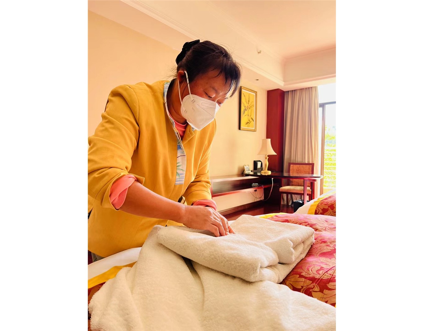 12月16日酒店又迎來大批客人入住,為確保新到店客人能及時(shí)、順利入住,酒店一百多間退房急需在當(dāng)日中午13點(diǎn)前全部完成清掃、消殺工作。因大部分客人退房集中在11點(diǎn)左右,且已有部分客人抗原陽性,面臨人員缺、時(shí)間緊、任務(wù)重的挑戰(zhàn),酒店立即組織幫扶調(diào)度會,酒店駐店總經(jīng)理帶隊(duì)全體員工深入一線作業(yè),在有序分工安排后,各自奔赴“戰(zhàn)場”爭分奪秒、積極搶房。僅在兩個小時(shí)內(nèi)便完成房間清掃、室內(nèi)整理、消殺換洗和入房引領(lǐng)工作,保證當(dāng)日兩百多名客人順利入住。