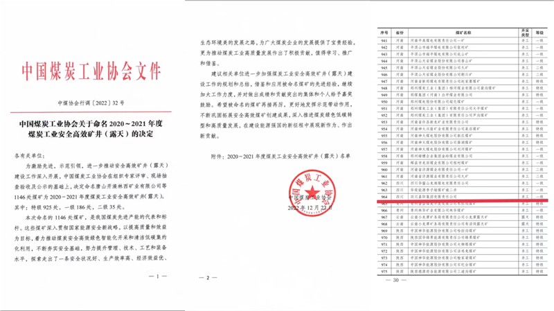 安全高效礦井是我國煤炭先進產(chǎn)能的代表和標桿。12月22日,根據(jù)《中國煤炭工業(yè)協(xié)會關(guān)于命名2020-2021年度煤炭工業(yè)安全高效礦井(露天)的決定》(中煤協(xié)會行調(diào)〔2022〕32號)文件,嘉陽煤礦從全國一千一百多家煤礦企業(yè)中脫穎而出,被命名為全國煤炭工業(yè)安全高效一級礦井(露天),再次蟬聯(lián)這一殊榮。
