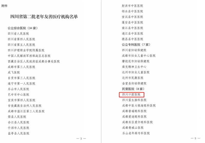 1月3日,四川省衛(wèi)生健康委員會(huì)下發(fā)《關(guān)于認(rèn)定四川省第二批老年友善機(jī)構(gòu)名單的通知》(川衛(wèi)老齡函〔2022〕248號(hào)),四川口腔醫(yī)院成功獲批“四川省第二批老年友善醫(yī)療機(jī)構(gòu)”稱(chēng)號(hào)。