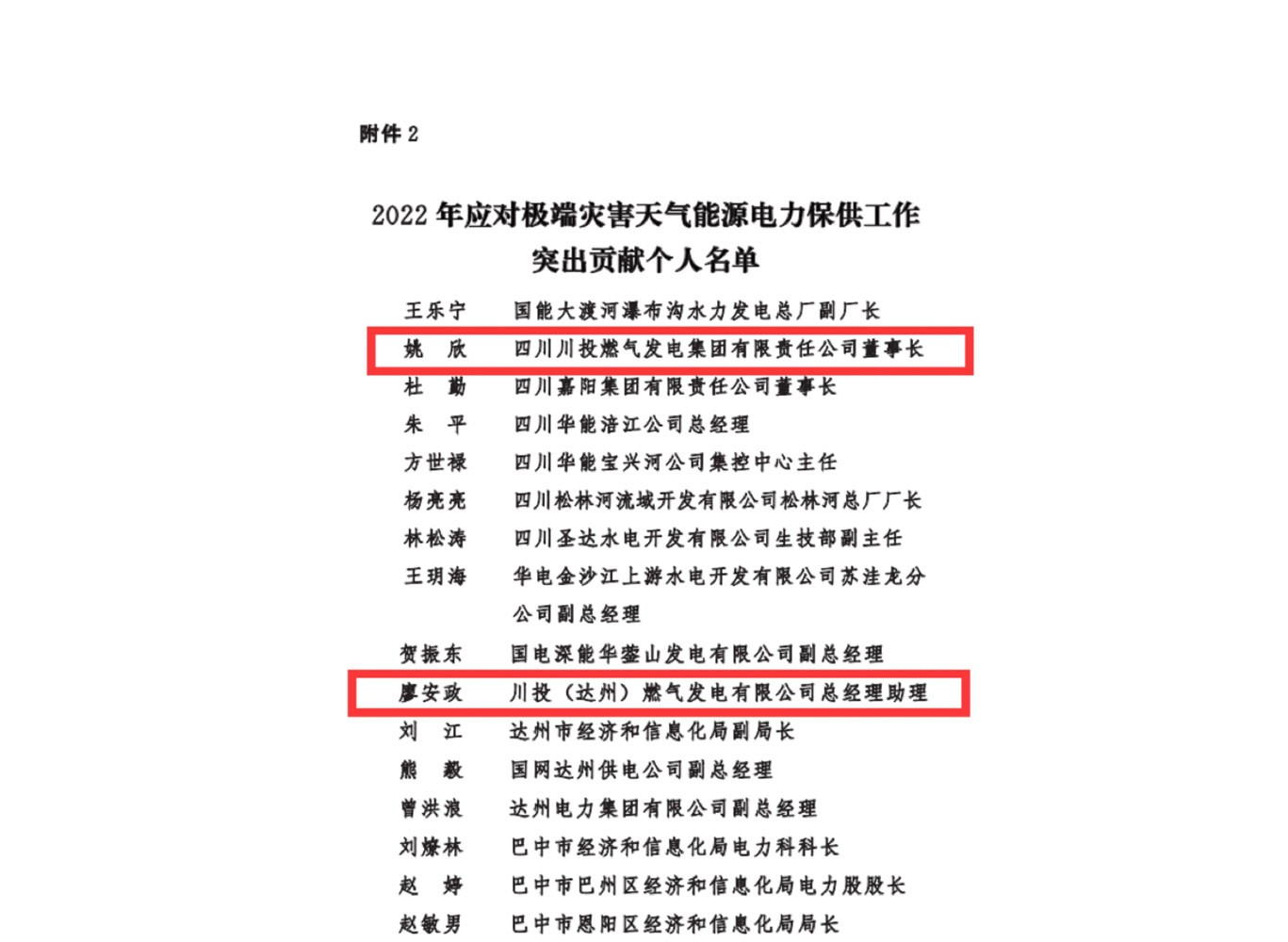 2022年12月31日,中國共產(chǎn)黨四川省委員會發(fā)布《關(guān)于表揚2022年應(yīng)對極端災(zāi)害天氣能源電力保供工作突出貢獻集體和個人的通報》(川委〔2022〕796號),川投燃電集團黨委書記、董事長姚欣、達州氣電公司總經(jīng)理助理廖安政榮獲“2022年應(yīng)對極端災(zāi)害天氣能源電力保供工作突出貢獻”獎。這是省委、省政府對川投燃電集團能源保供工作的高度肯定。