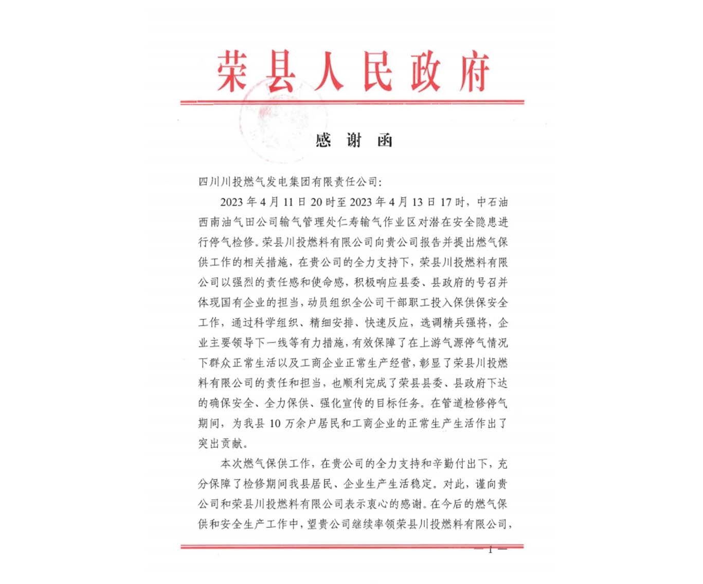 4月23日,川投燃電收到榮縣人民政府發(fā)來(lái)的感謝函,對(duì)川投燃電及所屬榮縣川燃公司在中石油西南油氣田公司輸氣管理處仁壽輸氣作業(yè)區(qū)管道檢修停氣期間有效保障榮縣10萬(wàn)余戶居民和企業(yè)正常生產(chǎn)生活所作出的重要貢獻(xiàn)表示衷心地感謝。