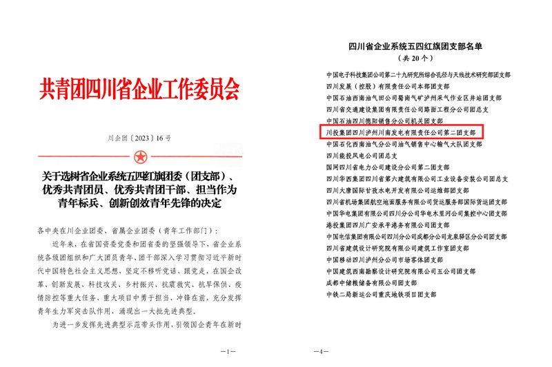 近日,共青團四川省企業(yè)工作委員會發(fā)布《關(guān)于選樹省企業(yè)系統(tǒng)五四紅旗團委(團支部)、優(yōu)秀共青團員、優(yōu)秀共青團干部、擔當作為青年標兵、創(chuàng)新創(chuàng)效青年先鋒的決定》,川南發(fā)電公司第二團支部被授予四川省企業(yè)系統(tǒng)五四紅旗團支部。