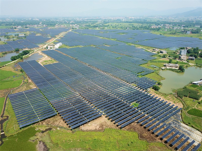 在廣西壯族自治區(qū)桂平市中部偏西,坡地上一大片高高架起的光伏藍板排列有序、十分顯眼,空中俯瞰猶如一汪藍色海洋,蔚為壯觀,與四周環(huán)繞的綠色田野構成了一幅壯美和諧的生態(tài)畫卷。