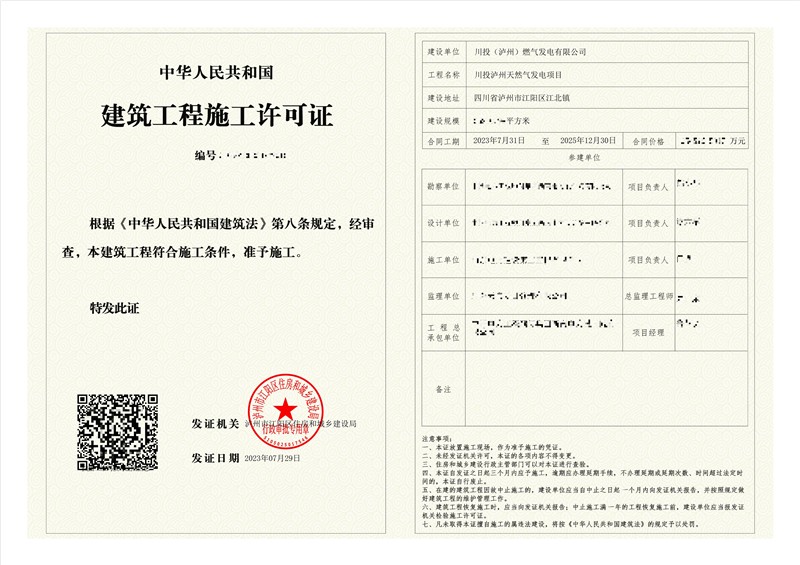 繼7月27日取得建設(shè)用地土地產(chǎn)權(quán)證書、建設(shè)用地規(guī)劃許可證及建設(shè)工程規(guī)劃許可證后,7月29日,川投瀘州天然氣發(fā)電項(xiàng)目再次取得重要進(jìn)展,順利取得項(xiàng)目施工許可證。至此,項(xiàng)目已具備開工所需的全部法定條件,正式邁入全面建設(shè)“快車道”。
