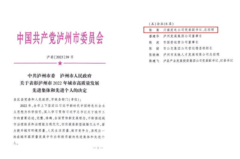 近期,中共瀘州市委、瀘州市人民政府發(fā)布了《關(guān)于表彰瀘州市2022年城市高質(zhì)量發(fā)展先進集體和先進個人的決定》,公司黨委副書記、總經(jīng)理陳嵩獲“瀘州市2022年城市高質(zhì)量發(fā)展先進個人”通報表彰,是榮獲表彰的6家企業(yè)先進個人之一。