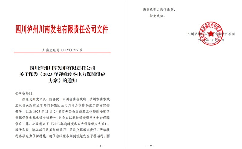 2023年入冬以來(lái),四川電力供需處于緊平衡狀態(tài),全川燃煤發(fā)電機(jī)組能開(kāi)盡開(kāi)、應(yīng)發(fā)盡發(fā),其“兜底頂峰”保供頂梁柱作用進(jìn)一步凸顯。公司堅(jiān)決貫徹落實(shí)省委省政府、省國(guó)資委決策部署和瀘州市委市政府、川投集團(tuán)各項(xiàng)工作安排,把電力保供作為當(dāng)前最重要的政治任務(wù),全面推進(jìn)迎峰度冬保電各項(xiàng)工作。