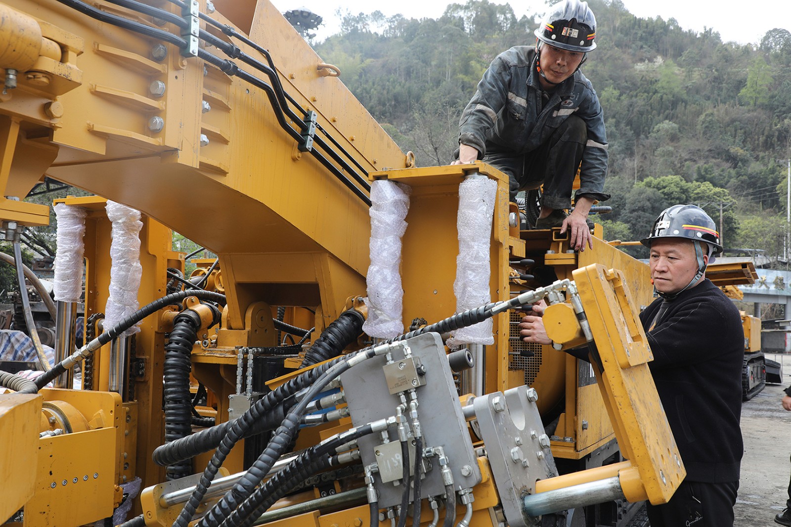 組裝成型后的兩臺主要設(shè)備按照正常生產(chǎn)工藝在工業(yè)廣場前后排列開始通電調(diào)試,職工在廠家技術(shù)員指導(dǎo)下,主要察看設(shè)備部件旋轉(zhuǎn)、升降、移動工況,細(xì)心查找組裝瑕疵,試用本機操控和遠(yuǎn)程遙控控制設(shè)備運行。目前,掘進(jìn)一隊在具備普通綜掘機生產(chǎn)經(jīng)驗的基礎(chǔ)上,采取設(shè)備調(diào)試與實操訓(xùn)練同步的方式助力職工盡快進(jìn)入角色。