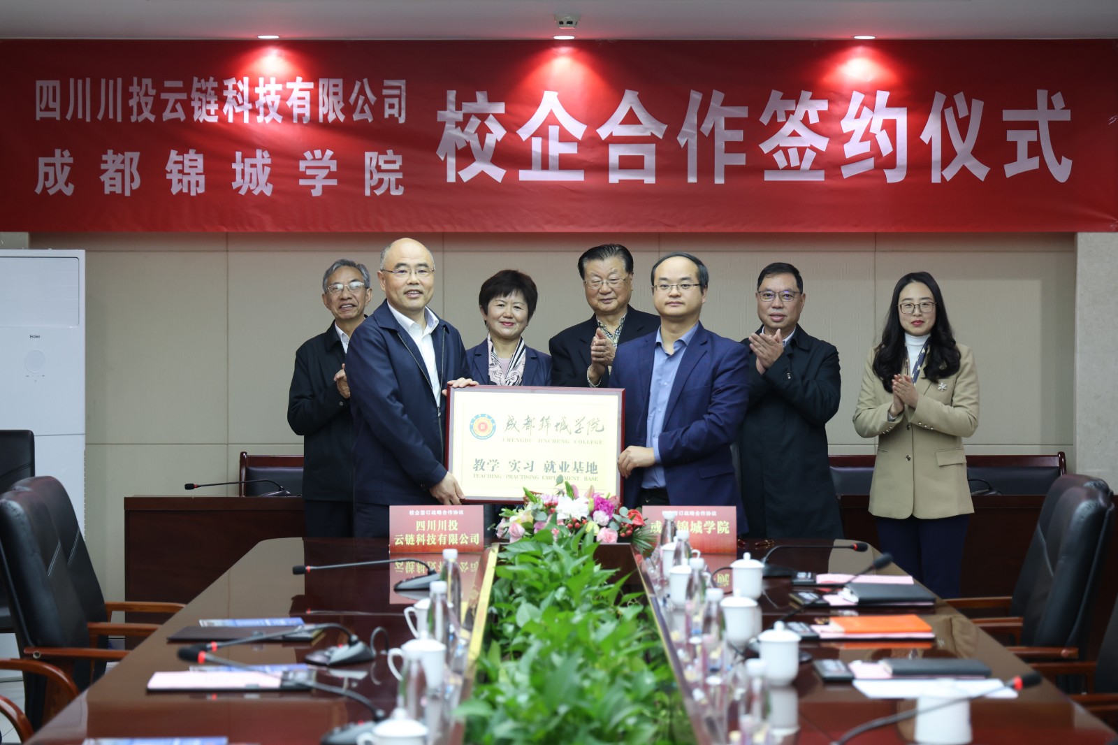 在雙方領導及嘉賓的共同見證下,川投云鏈和錦城學院正式簽約。同時,錦城學院為川投云鏈授予“教學 實習 就業(yè)基地”牌匾,正式開啟校企協(xié)同育人新篇章。
