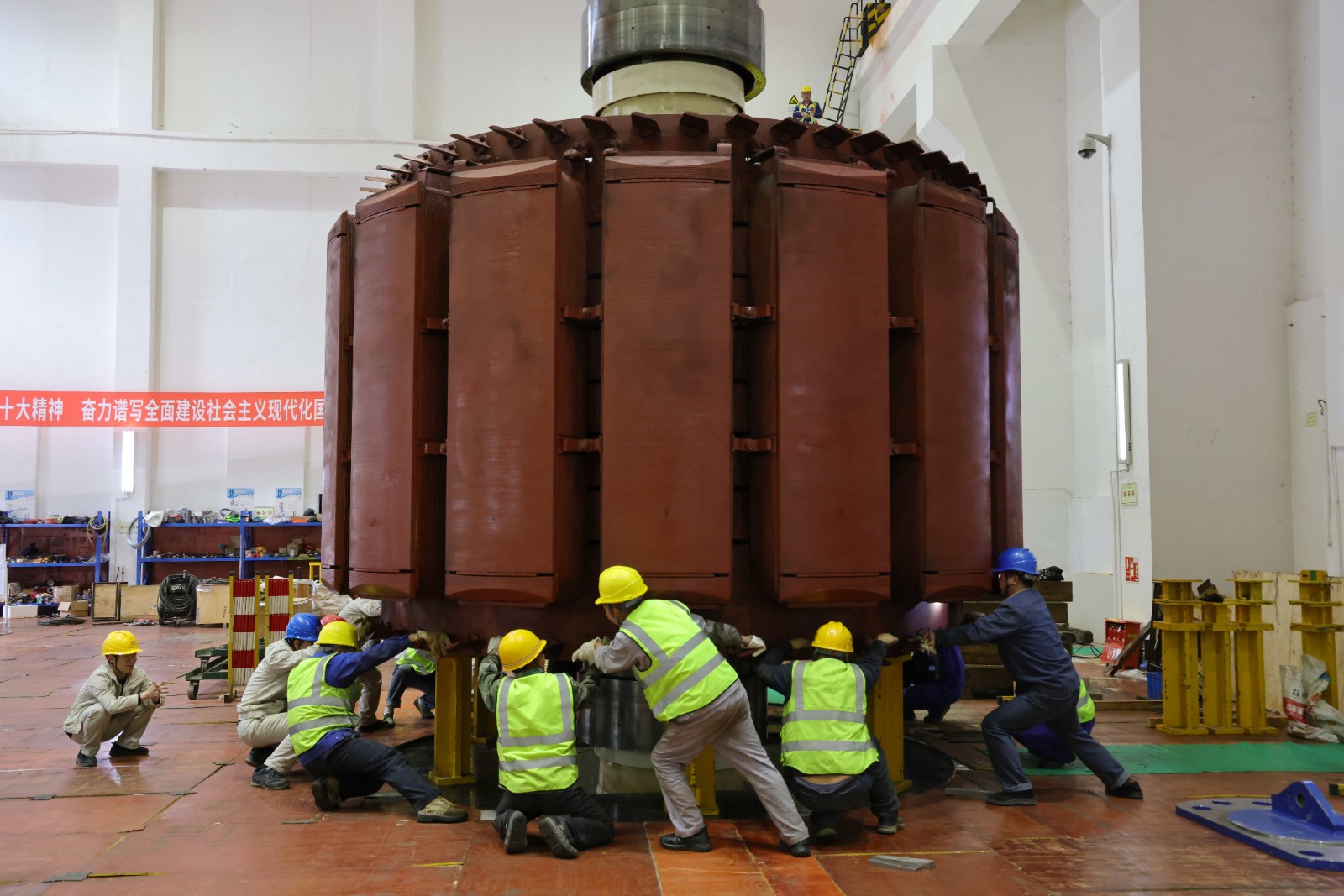 為確保轉(zhuǎn)子吊出一次性成功,轉(zhuǎn)子起吊前,田灣河公司機組大修監(jiān)理組專業(yè)技術人員會同施工方,對橋機再次進行了聯(lián)合檢查,對轉(zhuǎn)子吊出的各項準備工作進行再次確認,確保轉(zhuǎn)子吊出具備充分條件。14時許,各項安全保障措施準備就緒,檢修負責人向楊坤匯報各項準備工作并申請轉(zhuǎn)子吊出作業(yè),楊坤隨即下達“同意起吊”指令。經(jīng)過近一個半小時的持續(xù)奮戰(zhàn),重約260噸的轉(zhuǎn)子被平穩(wěn)地放在安裝間轉(zhuǎn)子支墩上,轉(zhuǎn)子吊出工作順利完成,金窩1#機組大修的首個關鍵節(jié)點目標如期實現(xiàn)。