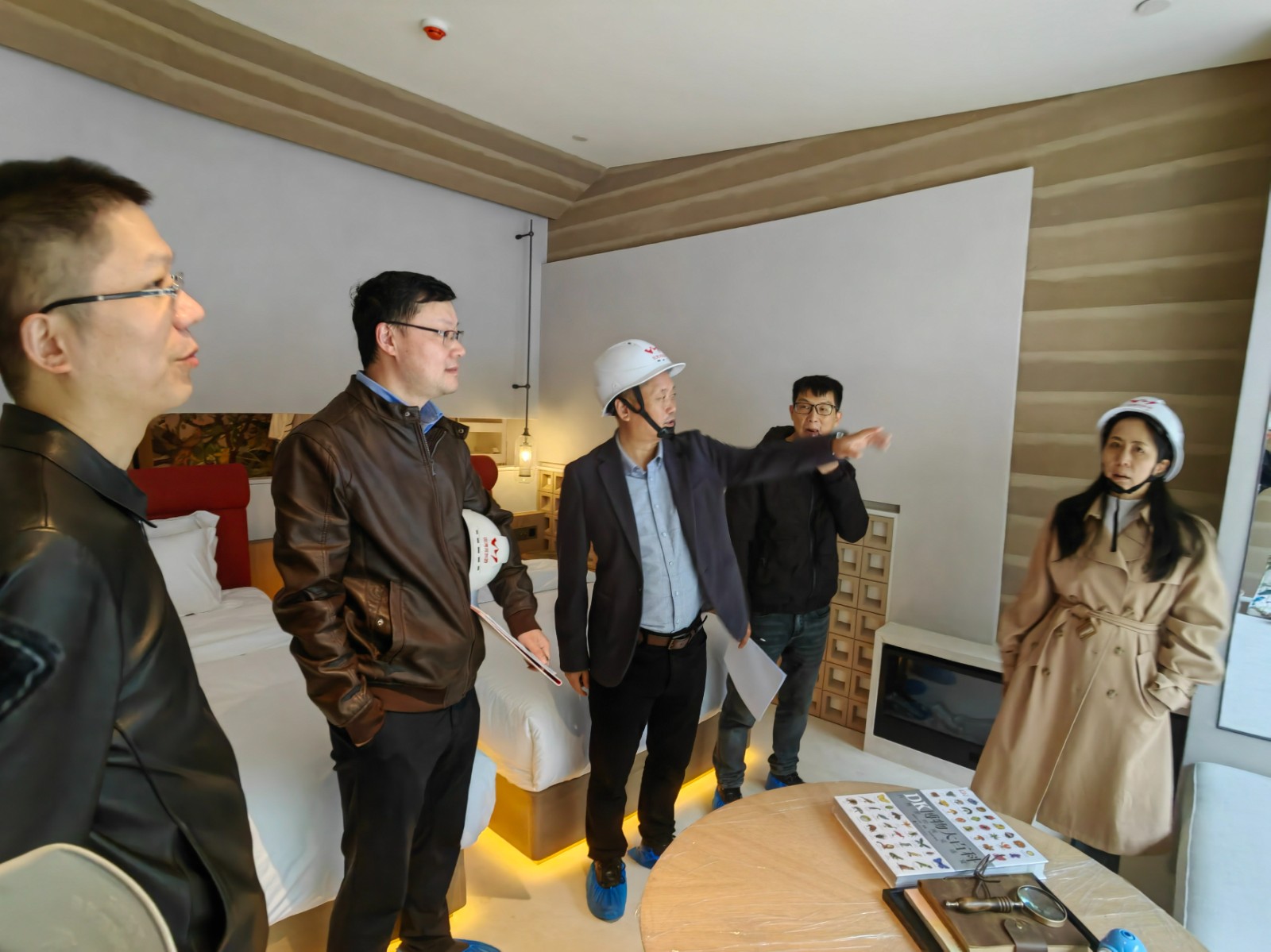 此次評審的樣板間為項目核心設(shè)施溫泉酒店主型客房,為做好評審,田灣河旅游公司精心策劃,組織酒店管理公司及設(shè)計、監(jiān)理、施工等參建單位專業(yè)技術(shù)人員組成評審組,現(xiàn)場對照設(shè)計效果圖,從平面布局、實物還原度、色彩搭配、施工質(zhì)量等方面對樣板間進(jìn)行全方位評審。經(jīng)過充分討論及意見交換,評審組一致認(rèn)為,樣板房整體還原度較高,基本與效果圖一致,同時對局部需優(yōu)化調(diào)整的地方提出了改進(jìn)意見建議。