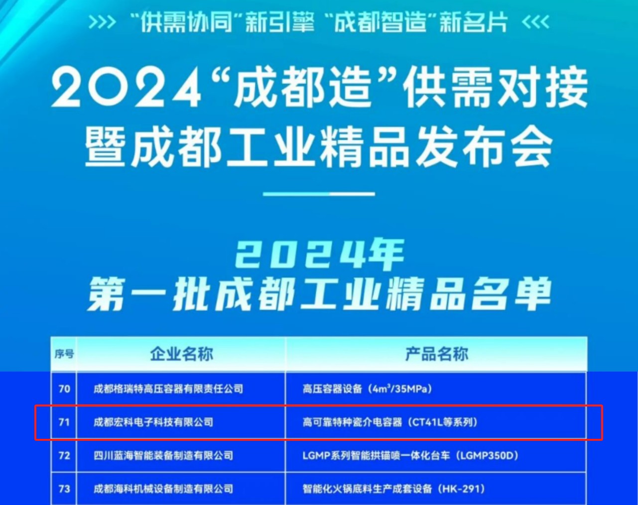 據(jù)悉,本次活動由成都市經(jīng)濟(jì)和信息化局市新經(jīng)濟(jì)發(fā)展委員會(成都市扶持名優(yōu)產(chǎn)品領(lǐng)導(dǎo)小組辦公室)主辦,旨在推動“成都造”企業(yè)增品種、提質(zhì)量、創(chuàng)品牌,加快成都產(chǎn)品向成都品牌轉(zhuǎn)變。第一批成都工業(yè)精品共評選認(rèn)定100家企業(yè)的100項(xiàng)產(chǎn)品,宏明宏科憑借高可靠特種瓷介電容器(CT41L等系列)產(chǎn)品成功入選。