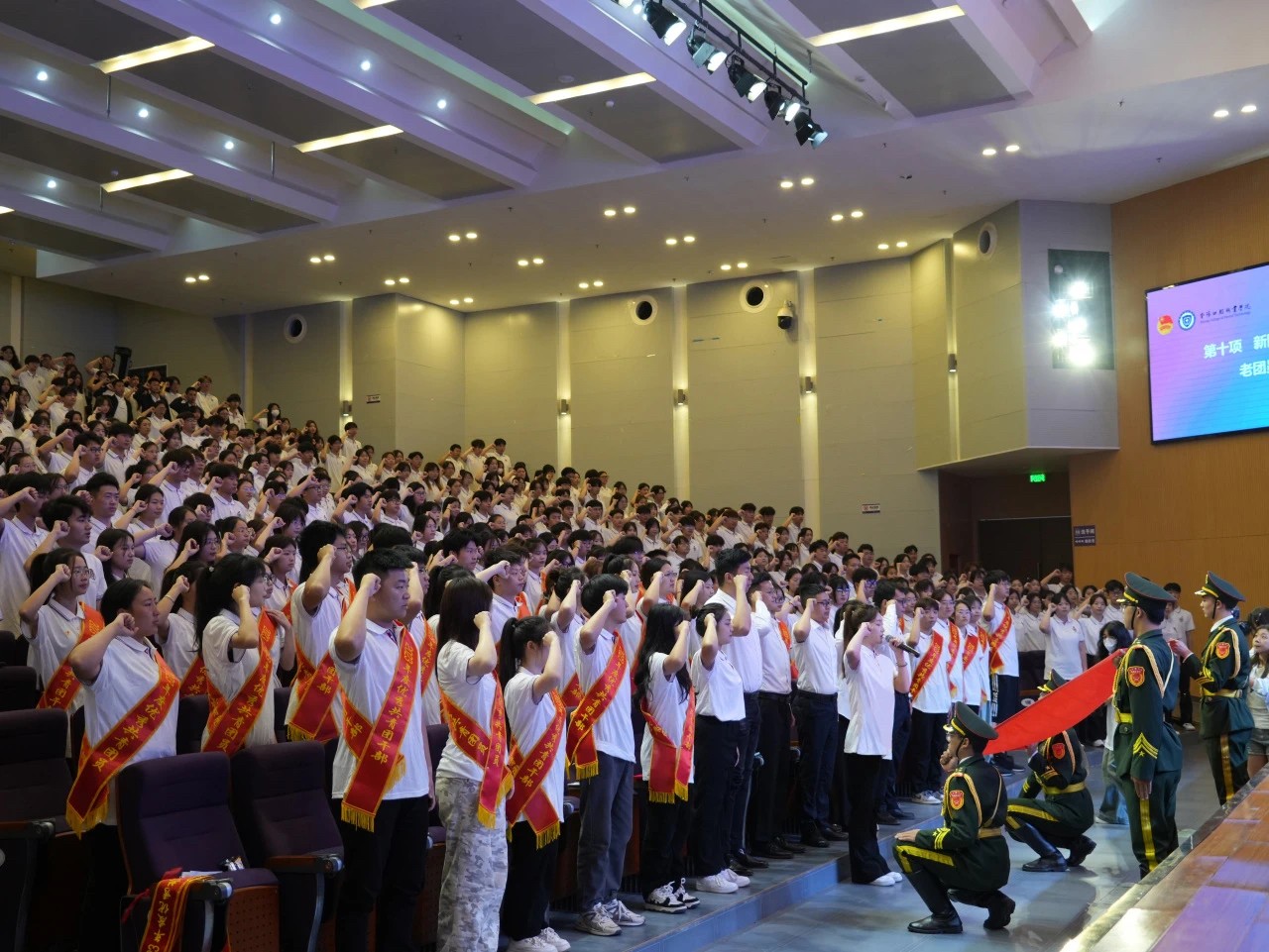入團(tuán)儀式上,學(xué)生工作部部長許宏君宣讀《2024年上半年新團(tuán)員入團(tuán)名單》,與會領(lǐng)導(dǎo)為新團(tuán)員佩戴團(tuán)徽、頒發(fā)團(tuán)員證。全體新老團(tuán)員莊嚴(yán)宣誓。