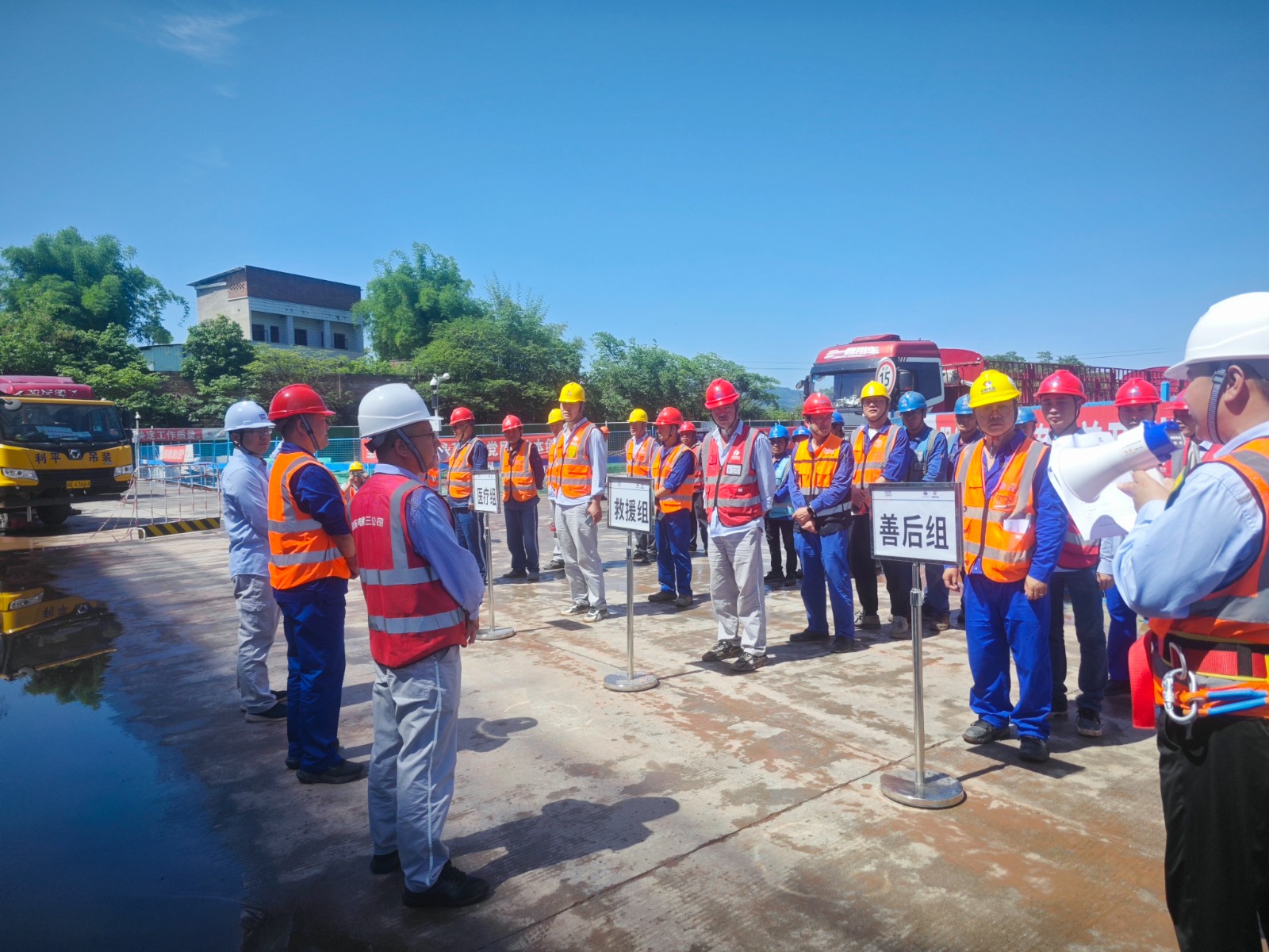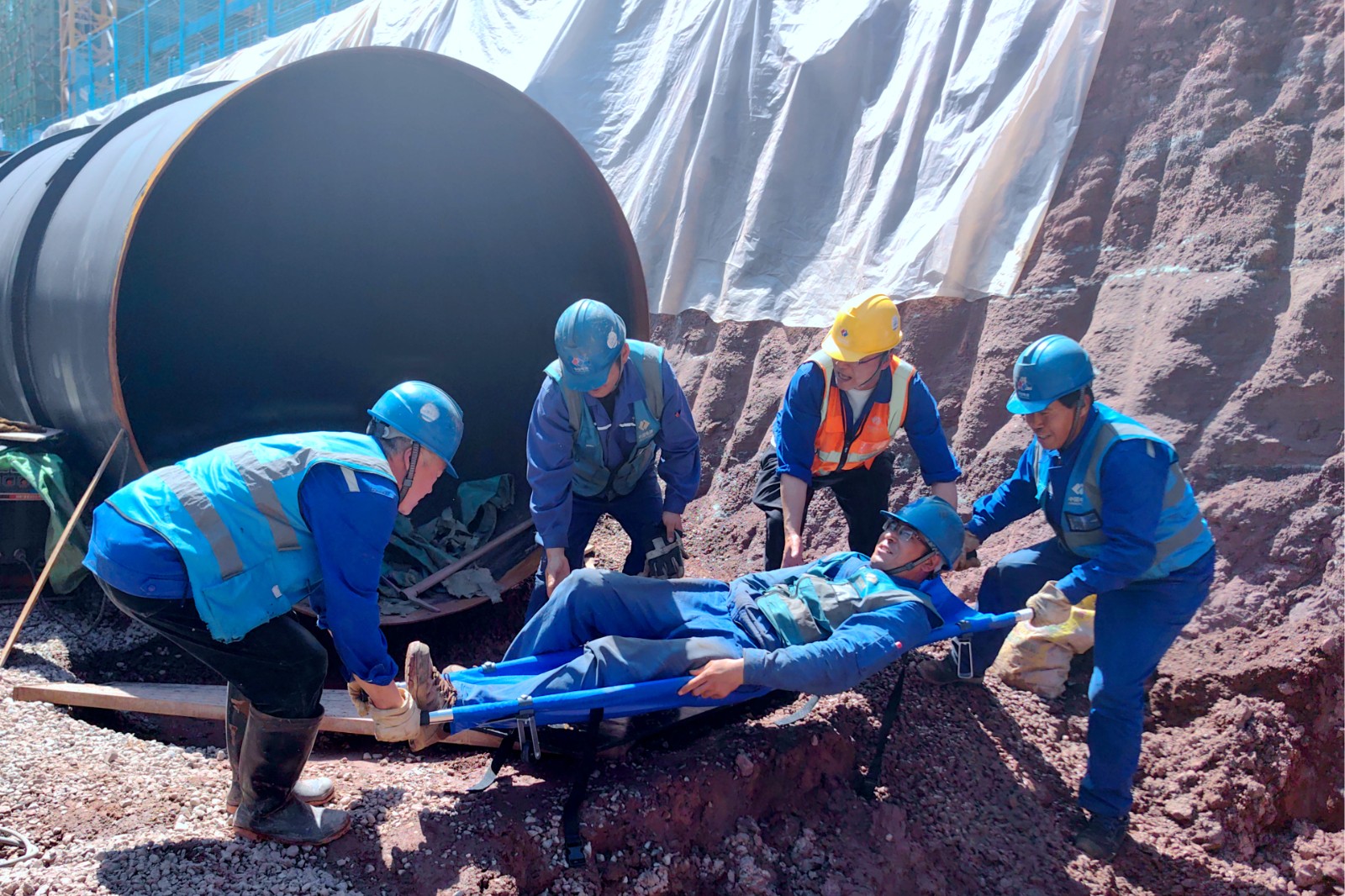 本次演練分為醫(yī)療、救援、后勤、善后4個(gè)小組,采用實(shí)戰(zhàn)形式進(jìn)行演練。演練模擬場景為:5月13日下午,施工現(xiàn)場驟降暴雨造成循環(huán)水泵房北側(cè)的循環(huán)水管道基槽邊坡發(fā)生局部塌方,塌方導(dǎo)致基坑下方一名作業(yè)人員和工器具被掩埋,循環(huán)水泵房基坑內(nèi)流入大量積水,如不及時(shí)進(jìn)行抽排可能導(dǎo)致基坑邊坡浸泡發(fā)生大面積坍塌事故,需立即組織人員搶險(xiǎn)。接到險(xiǎn)情報(bào)警后,防汛應(yīng)急指揮部迅速啟動(dòng)應(yīng)急機(jī)制,第一時(shí)間組織應(yīng)急救援隊(duì)火速趕赴目標(biāo)地點(diǎn),按照防汛應(yīng)急方案,著眼實(shí)戰(zhàn),進(jìn)行了緊急救險(xiǎn)、轉(zhuǎn)移傷員、人員排查、積水抽排等應(yīng)急救援。