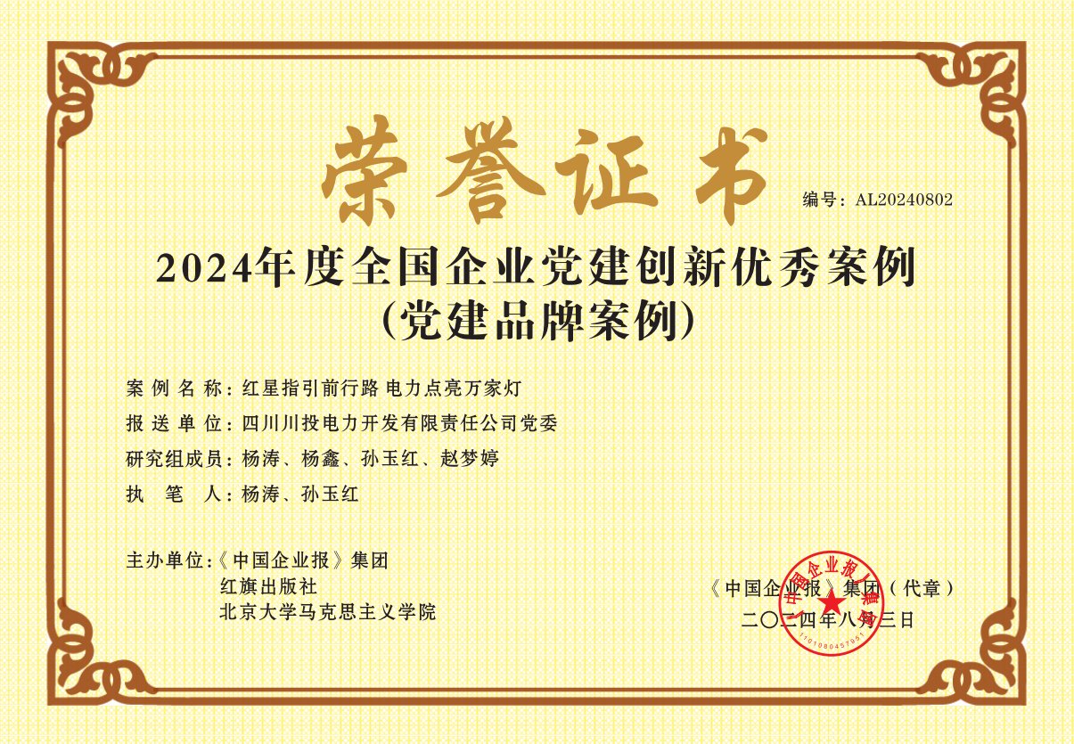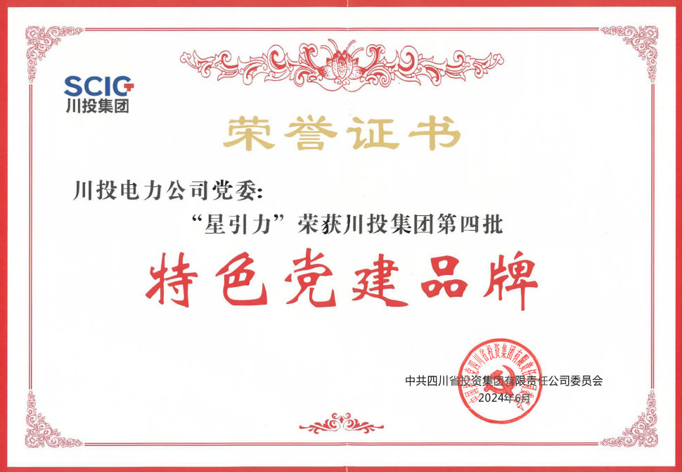 2024年以來,川投電力黨委黨建品牌“星引力”在川投能源黨委的指導下,先后榮獲川投集團第四批特色黨建品牌,《中國企業(yè)報》集團、紅旗出版社、北京大學馬克思主義學院聯(lián)合頒發(fā)的“2024年度全國企業(yè)黨建創(chuàng)新優(yōu)秀案例(黨建品牌案例)”,四川省企業(yè)聯(lián)合會、四川省企業(yè)家協(xié)會聯(lián)合頒發(fā)的“2022-2023年度黨建文化優(yōu)秀成果一等獎”等榮譽。